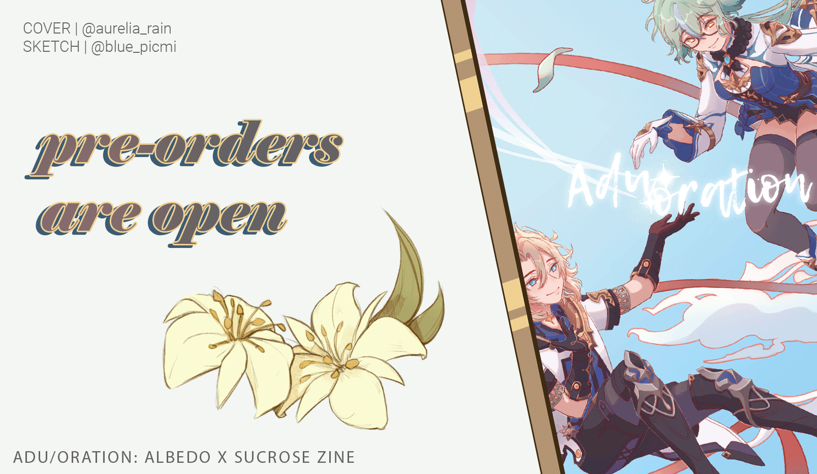 Aduration is a SFW, digital for-charity Zine that will feature the relationship between Albedo and Sucrose! We will be showcasing an array of art, writing, and maybe even poetry!